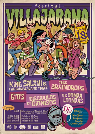 El festival Villajarana pretende que la cultura 'Rock and Roll' vuelva a Toledo y para ello ha programado un cartel con los grupos The Oompa Loompas, GTO's, Thee Braindrops, Discípulos de Dionisios y King Salami & Cumberland Three, que el próximo 18 de mayo estarán en la capital regional para celebrar un evento en distintas localizaciones de la ciudad.