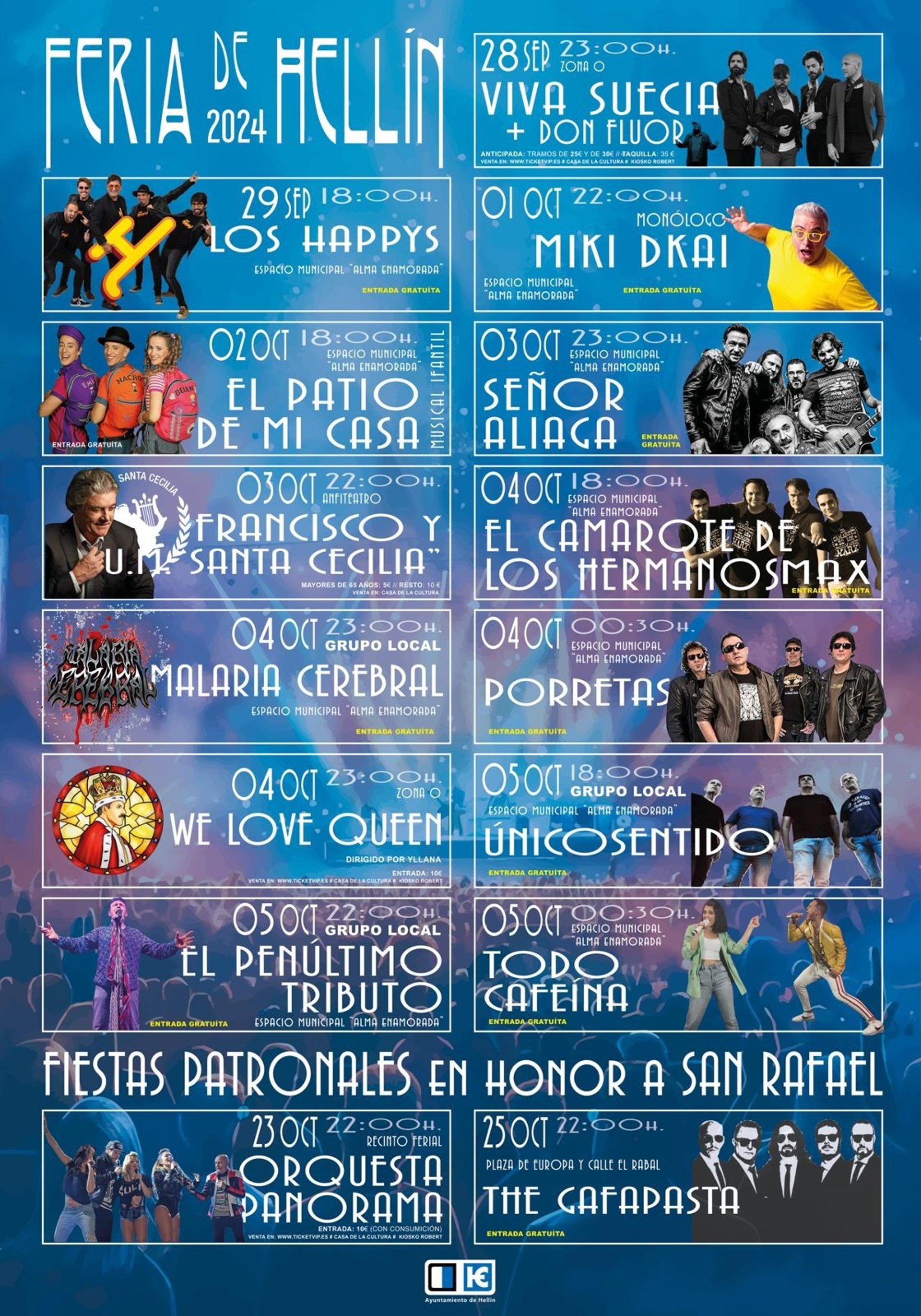 Viva Suecia, Francisco, We love Queen y Porretas encabezan el cartel de conciertos y actuaciones musicales de la Feria de Hellín 2024, que tendrán lugar entre el 28 de septiembre y el 6 de octubre en la localidad albaceteña.