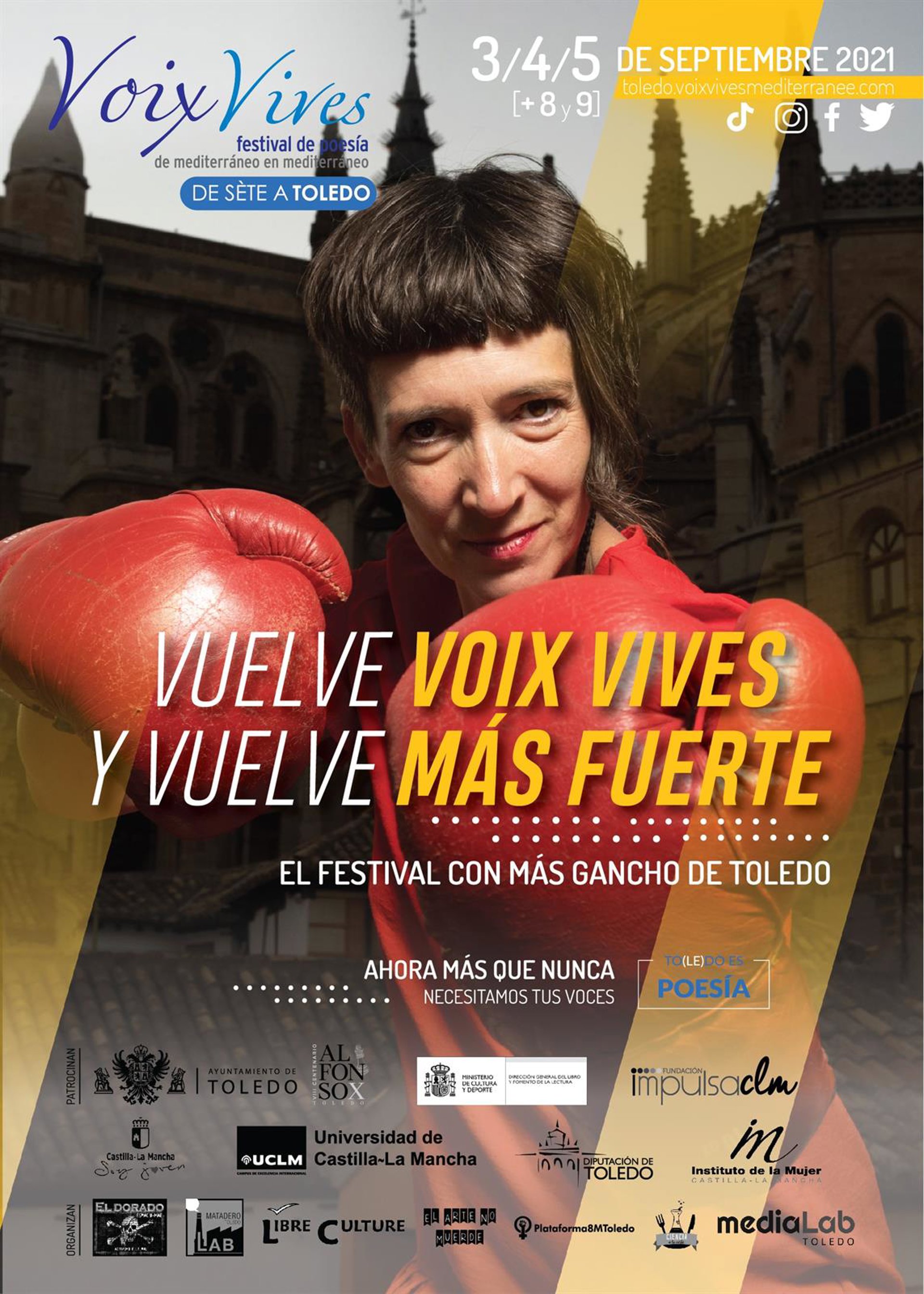 Voix Vives se celebrará del 3 al 5 de septiembre en el Casco histórico de Toledo y los días 8 y 9 con el curso de verano 'La poesía y su poder transformador', en el Castillo de San Servando, patrocinados por el Ayuntamiento de Toledo, la Fundación Impulsa, el Ministerio de Cultura, La UCLM y organizado por El Dorado AC, Matadero Lab, Libre Culture, la Plataforma 8M, Ciencia a la Carta y Media LAB Toledo.
