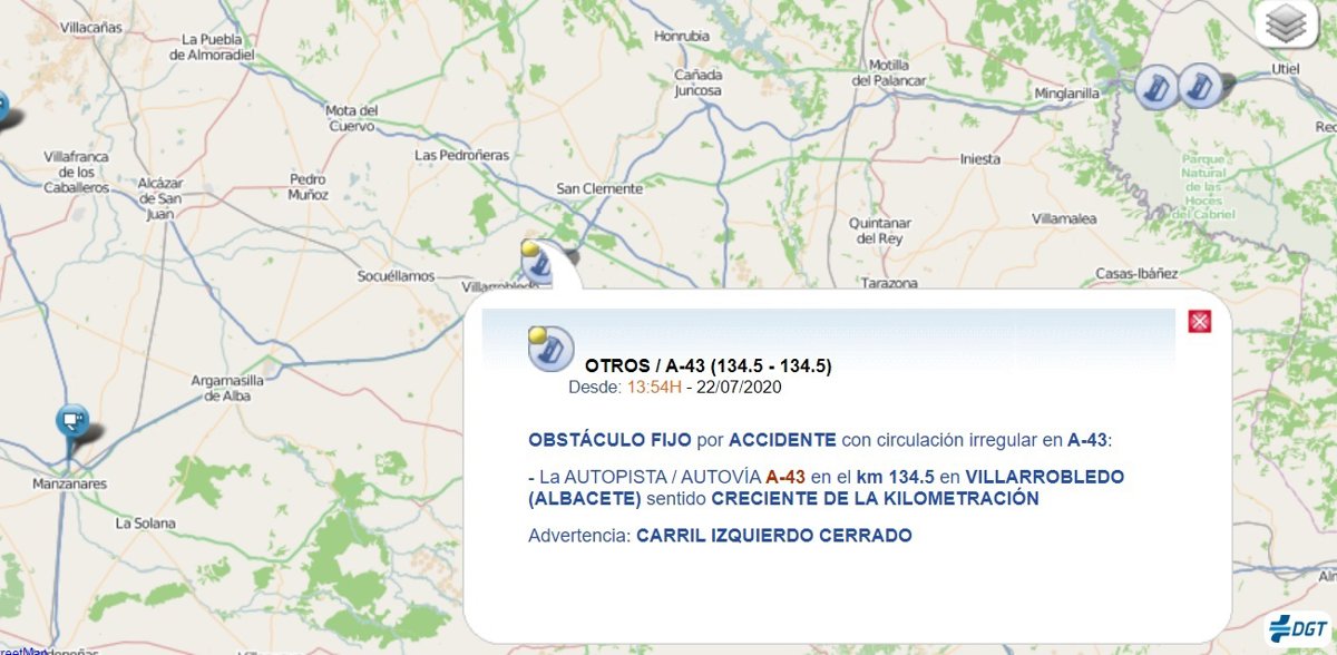 Según han confirmado a Europa Press fuentes del Servicio de Emergencias 112 de Castilla-La Mancha, el suceso ha ocurrido a las 13.10 de este miércoles en el kilómetro 132 de esta autovía. Para dar paso al tráfico se ha habilitado como vía alternativa la carretera nacional N-310.