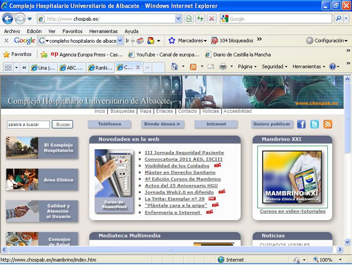 La web del Complejo Hospitalario Universitario de Albacete --www.chospab.es-- ocupa el quinto puesto de las publicaciones electrónicas de centros hospitalarios españoles en el Ranking Web de Hospitales del Mundo y el puesto 277 entre los europeos.