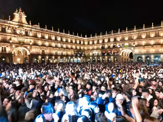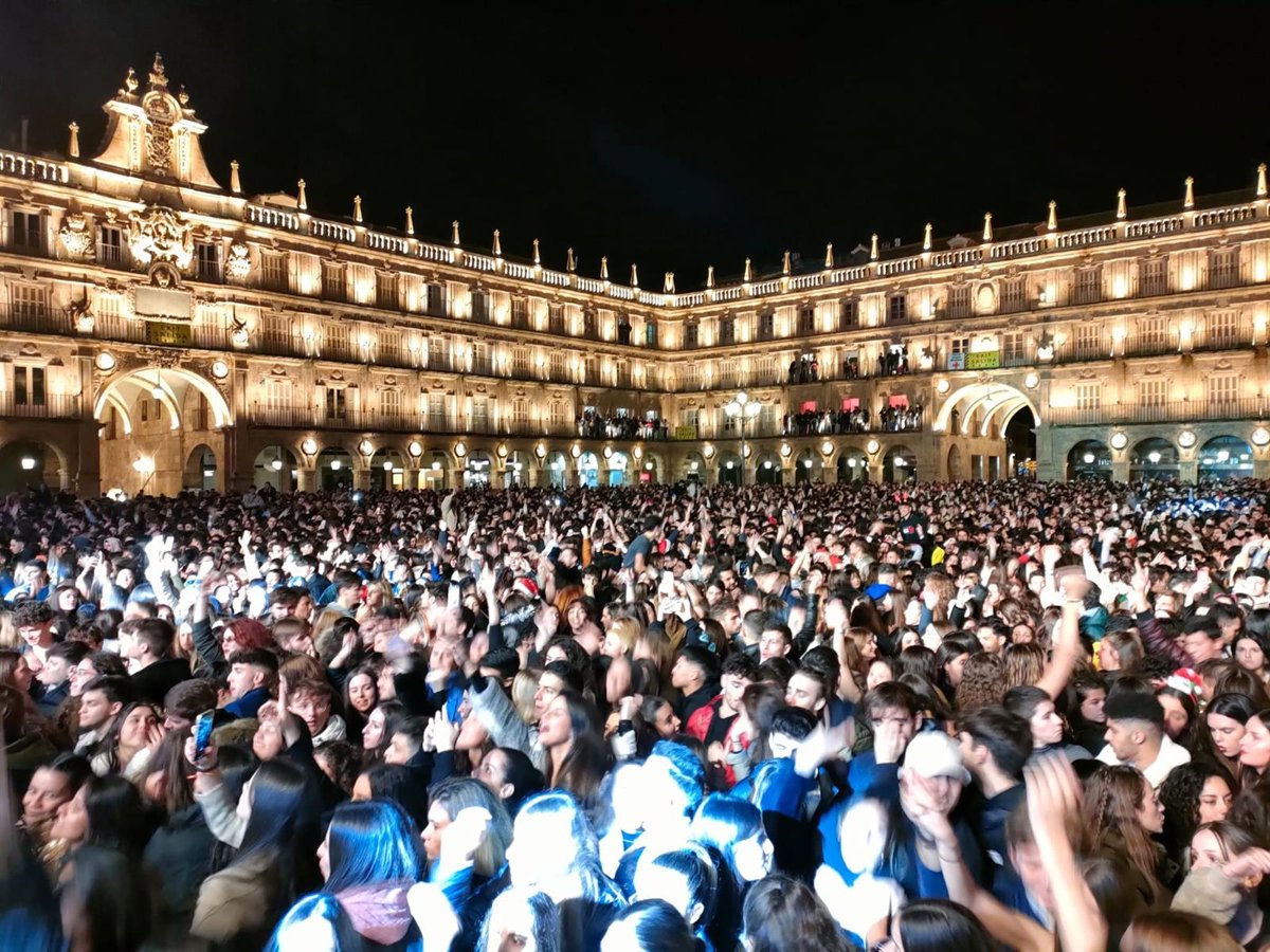 Unos 20.000 jóvenes han celebrado esta pasada medianoche el Fin de Año Universitario en la Plaza Mayor de Salamanca, un festejo que comenzó en la década de los 90 del pasado siglo y que se repite cada año, salvo durante la pandemia, con campanadas incluidas y con posterior fiesta en los locales de ocio de la ciudad.
