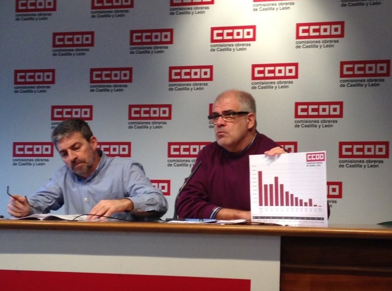 El secretario de Estudios y Asesoramiento Jurídico y Sindical de CC.OO Castilla y León, Carlos Castedo, y el secretario de Organización y Comunicación, Luis Fernando Gamazo, han detallado este lunes el estudio que desvela que el peso de las rentas de trabajo, en las que se incluyen las pensiones y las prestaciones por desempleo, es del 49,44 por ciento cuando ante de la crisis superaba en varios puntos el 50 por ciento.
