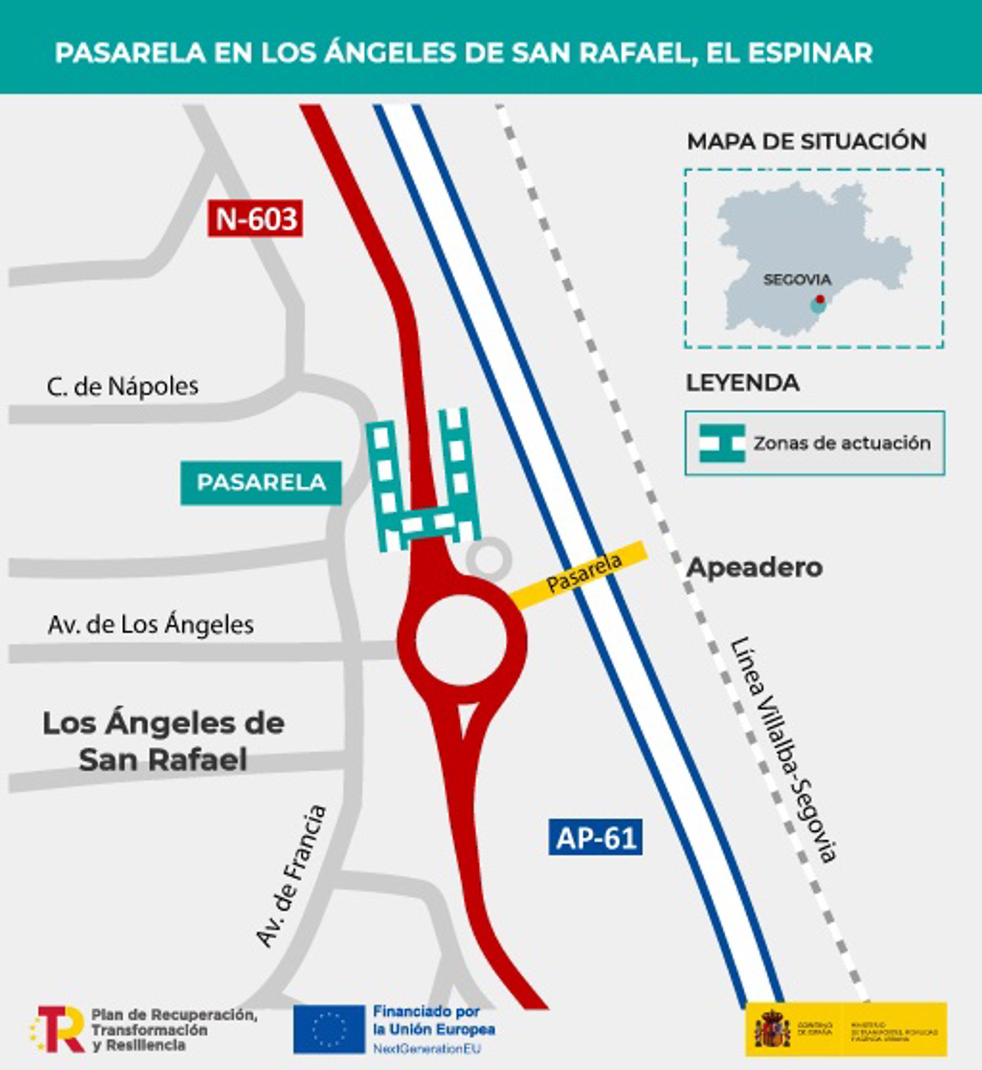 Las obras se llevan a cabo a la altura del kilómetro 71,150, donde se prevé que en la mencionada noche se coloque la viga que habilita el paso central de la pasarela sobre la N- 603, para lo que será necesario disponer de grúas de grandes dimensiones para la descarga, izado y colocación de la viga.