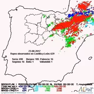 Las provincias de Burgos y Soria registraron el 94 por ciento de los 629 rayos que cayeron en la comunidad autónoma de Castilla y León a lo largo de la jornada del miércoles, 23 de agosto, según ha informado la Aemet en su cuenta de Twitter.