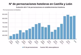 Los hoteles de Castilla y León computaron un total de 832.846 pernoctaciones en el mes de julio de 2019, un uno por ciento más que el mismo mes del año pasado, con una estancia media de 1,61 días frente a los 3,6 de la media nacional, de las que 625.797 correspondieron a viajeros españoles y 207.048 restantes fueron de viajeros extranjeros.