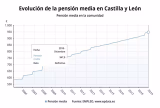 De las 613.669 pensiones registradas en la Comunidad, 38.853 pensionistas son de Ávila con una pensión media de 827,65 euros; 90.198 de Burgos (1.015,15 euros); 142.436 de León (941,61 euros); 42.275 de Palencia (970,74 euros); 80.457 de Salamanca (882,58 euros); 33.416 de Segovia (895,21 euros); 22.566 de Soria (894,36 euros); 114.239 de Valladolid (1.070,70 euros) y 49.229 pensionistas de Zamora (800,30 euros).