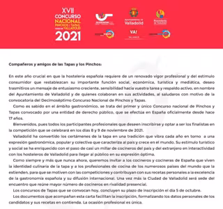 Carta del alcalde de Valladolid, Óscar Puente, por la que se abre la convocatoria para la XVII edición, que se celebrará en noviembre. - CONCURSO NACIONAL DE PINCHOS Y TAPAS DE VALLADOLID