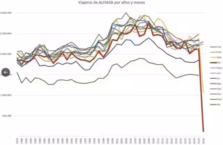 Gráfica con la evolución de viajeros en Auvasa en los últimos años. - AUVASA