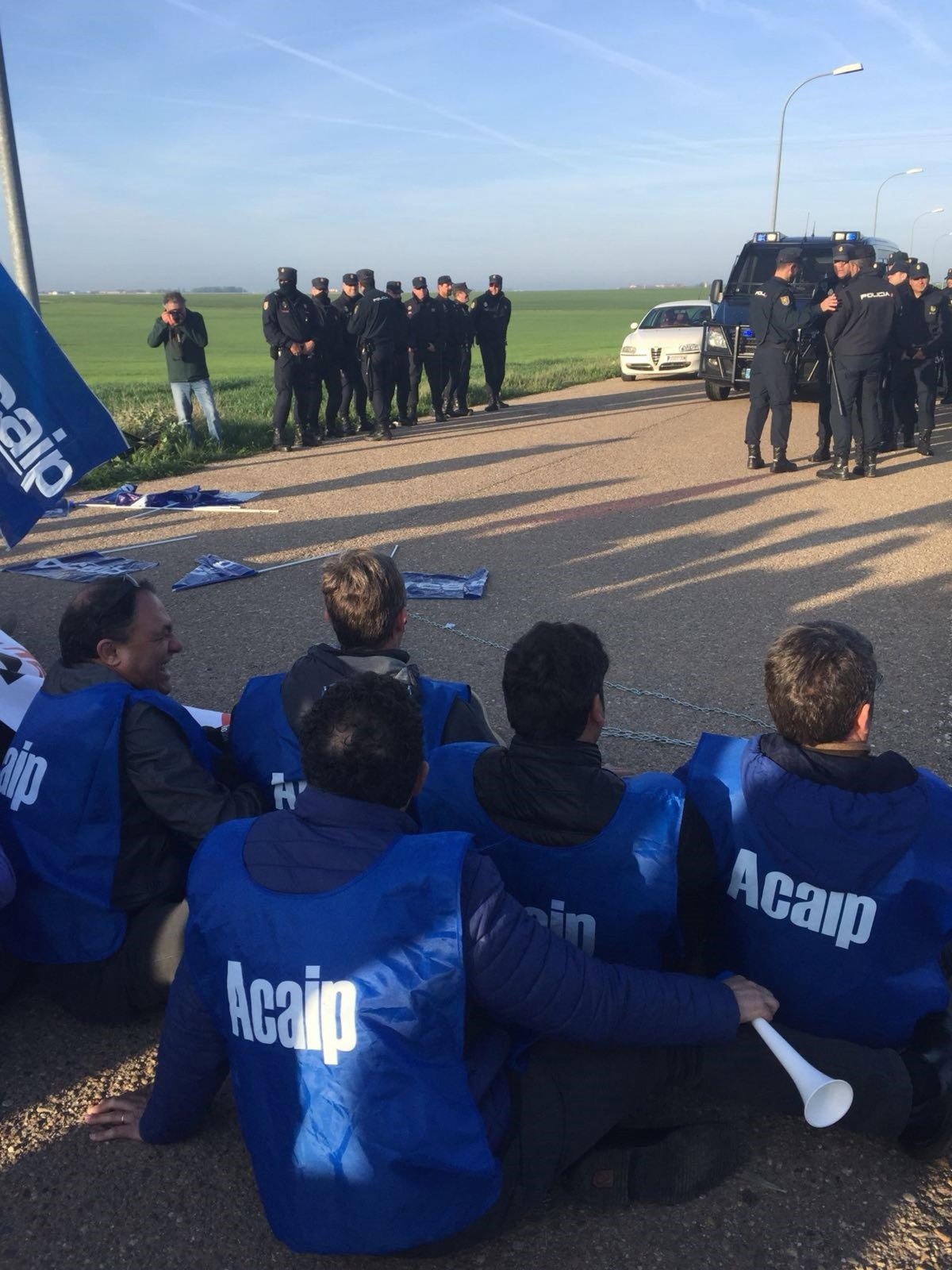 Los momentos de mayor tensión se han registrado a partir de las 07.50 horas, cuando el jefe de la UIP ha dado la orden de desalojar de dicho punto a los sindicalistas, que para entonces protagonizaban una sentada haciendo sonar sirenas y provistos de pancartas y de sus camisetas identificativas, azules en el caso de los representantes de ACAIP.