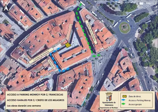 La calle Corrales de Monroy de Salamaca y la entrada al aparcamiento permanecerán cortados desde este lunes, 18 de julio, por trabajos de mantenimiento en la red de suministro de Aqualia, lo que obligará a acceder al estacionamiento por la calle Franciscas y a los garajes por Cristo de los Milagros.