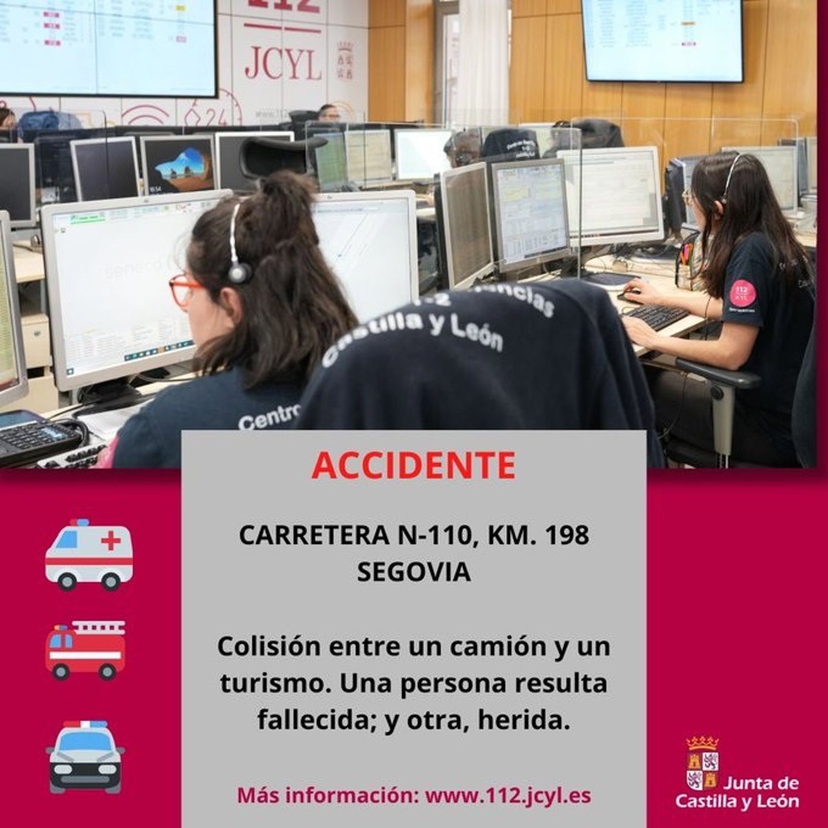 El 1-1-2 dio aviso de este accidente a la Guardia Civil de Tráfico de Segovia, a los Bomberos de Segovia y al Centro Coordinador de Urgencias (CCU) de Emergencias Sanitarias-Sacyl, desde el que se envió una UVI móvil y una ambulancia de soporte vital básico.