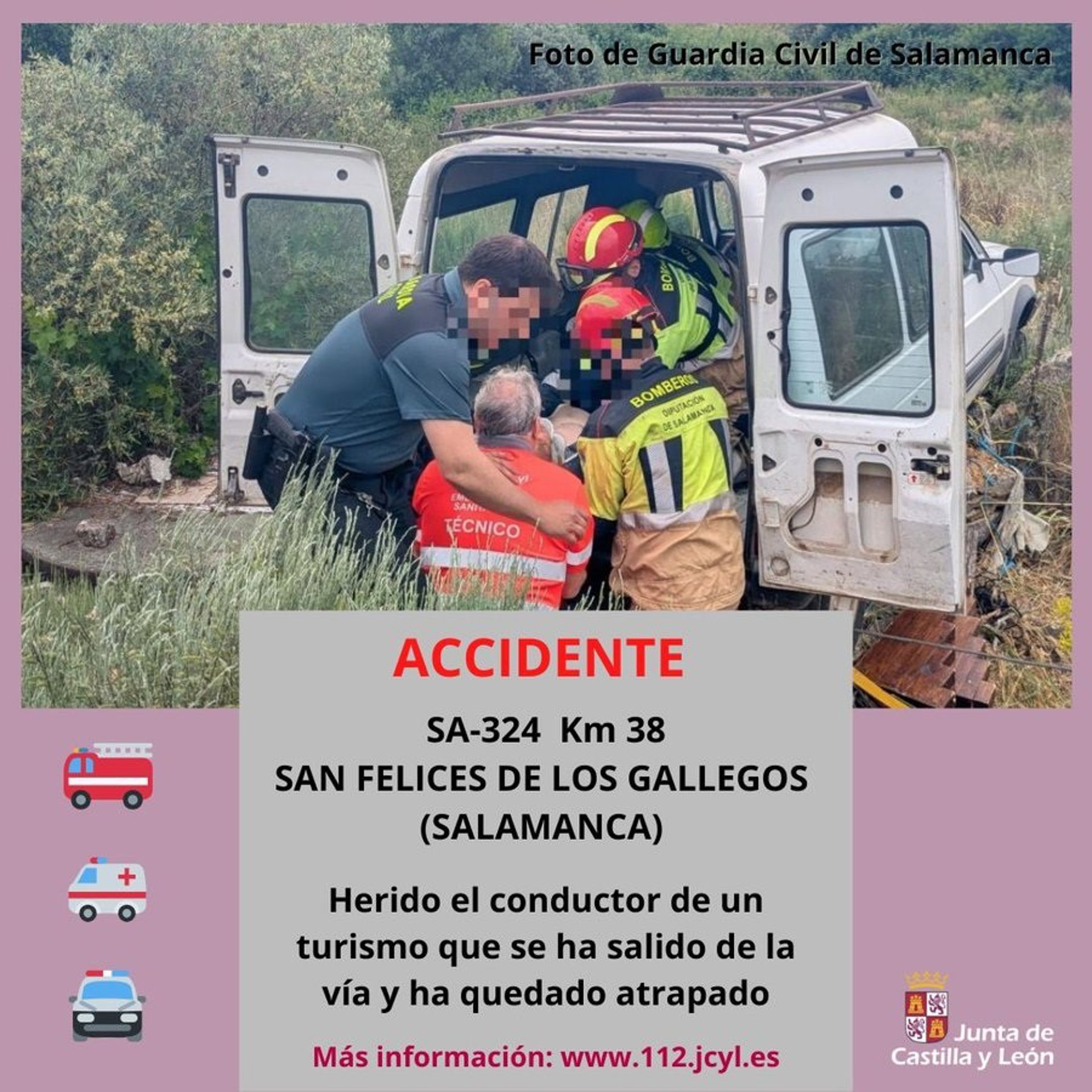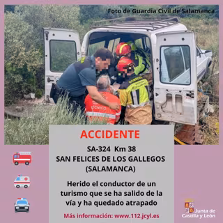 Los hechos han ocurrido alrededor de las 12.12 horas de este miércoles, 4 de junio, en el kilómetro 38 de la SA-324 en San Felices de los Gallegos donde según explicó el alertante que contactó con el 112 un turismo se había salido de la vía y había quedado a varios metros de la carretera contra una pared y cerca de un desnivel.