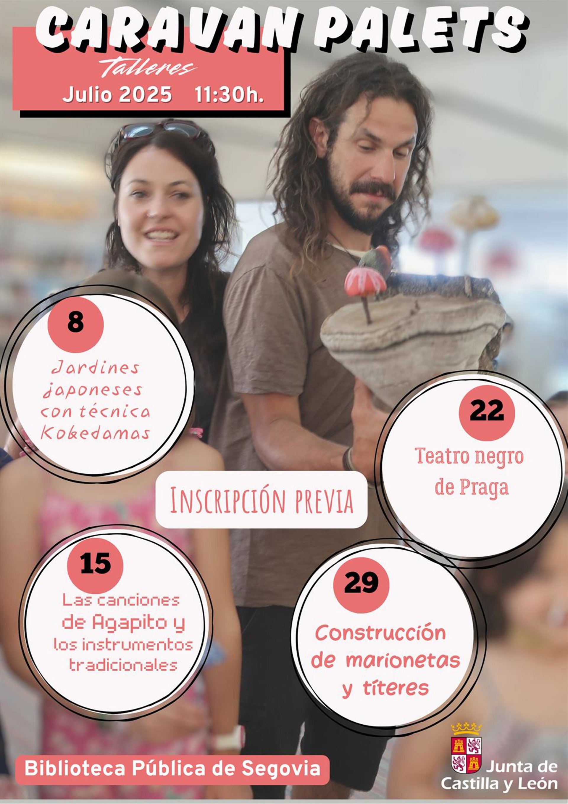 Los cuatro martes siguientes hay talleres a las 11.30 horas. El día 8 es para mayores de 5 años y se titula 'Jardines japoneses con técnica Kokedamas'. El día 15, para mayores de 3 años, dedicado a 'Las canciones de Agapito y los instrumentos tradicionales'. El martes 22, también para mayores de 3 años, taller 'Teatro Negro de Praga'. Y el domingo 29, para niños de 6 a 11 años, será 'Construcción de marionetas y títeres'. Todos los talleres están impartidos por el grupo Caravan Palets y para participar es necesario inscribirse previamente en la Biblioteca.