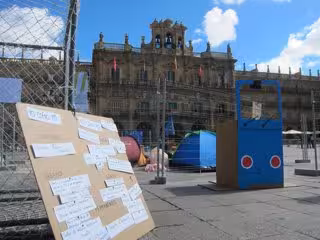 En el ágora salmantina se pueden ver unas siete tiendas, que permanecerán en este espacio público hasta el próximo lunes, tal y como recoge el programa de actividades que los activistas han colocado junto al campamento.