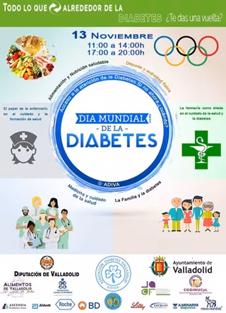 Al día siguiente, el sábado, la Asociación de Diabetes de Valladolid saldrá a la calle para estar presente en las diferentes mesas informativas que habrá por toda la capital (en San Benito, frente al Mercado del Val, con la Mesa de Farmacia; plaza de la Universidad, junto a la catedral, con la Mesa del Deporte; plaza Fuente Dorada, con la Mesa de Médicos; Plaza España, junto al colegio García Quintana, con la Mesa de Alimentación y Nutrición; Plaza Zorrilla, con la Mesa de Enfermería; y acera Recoletos, con la Mesa de ADIVA Familia y Diabetes).