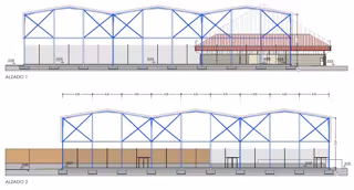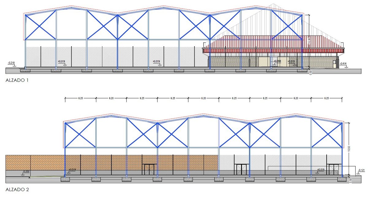 Las tres pistas de tenis se cubrirán con una estructura de once metros de altura en forma de panel sándwich acústico en acero galvanizado, mientras que en los laterales de la cubierta se realizará el cierre hasta una altura de cinco metros por debajo del alero.