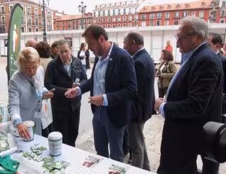 El presidente de la AECC de Valladolid, Javier Arroyo, ha recibido este jueves, en la mesa de cuestación instalada ante el Ayuntamiento de la capital, la visita de buena parte de los miembros de la Corporación municipal, encabezados por el alcalde, Óscar Puente, y también otros representantes políticos como el portavoz del PP en las Cortes regionales, Raúl de la Hoz.
