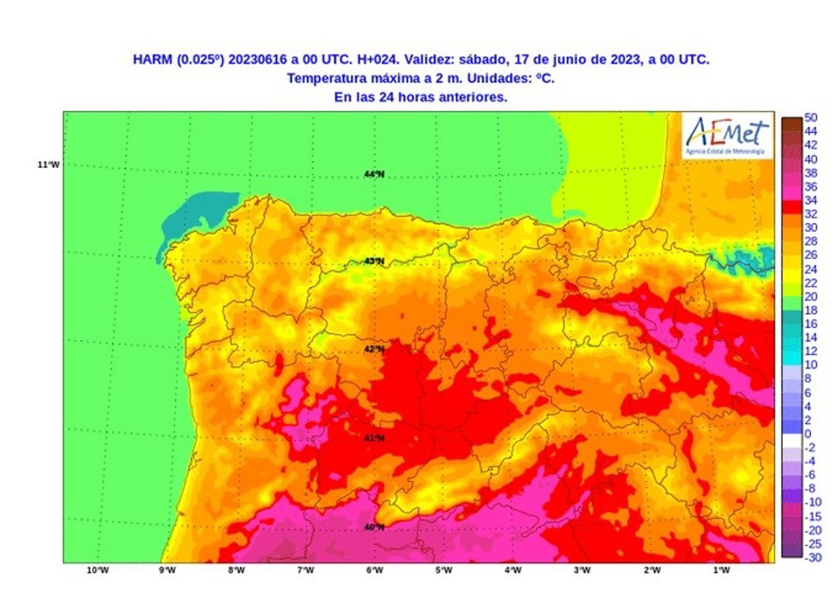Mapa elaborado por la Aemet sobre la previsión de temperaturas máximas para este viernes - @AEMET_CYL