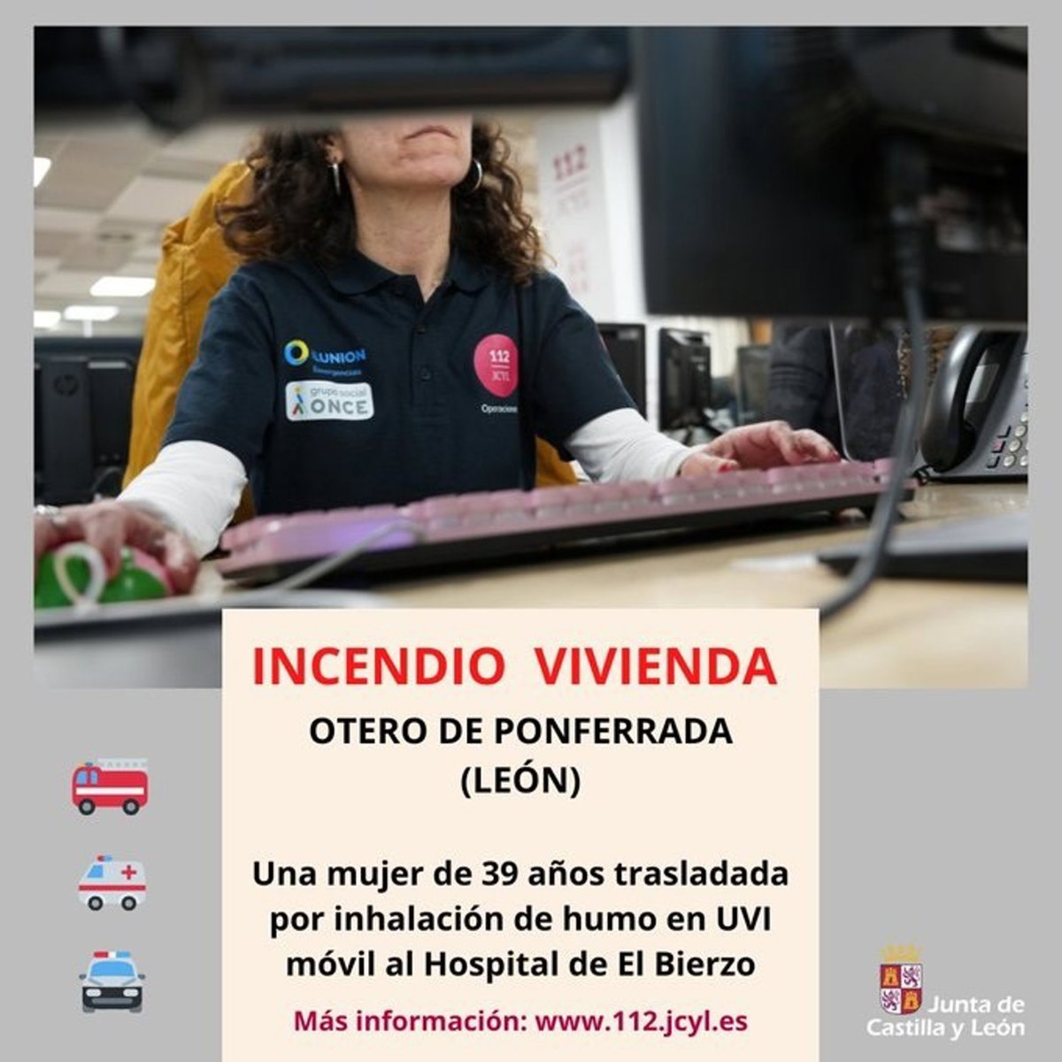 El 1-1-2 dio del incendio a los Bomberos y la Policía Local de Ponferrada y a Emergencias Sanitarias - Sacyl, ya que durante la extinción del incendio los Bomberos solicitaron asistencia sanitaria para una mujer de 39 años afectada por inhalación de humo.
