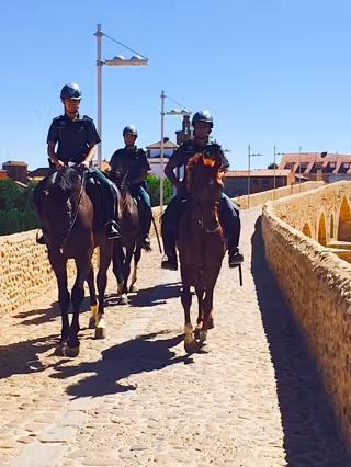 La puesta en marcha, un verano más, del dispositivo especial del 'Plan de Seguridad y Vigilancia en el Camino de Santiago' de la Guardia Civil, vuelve a reproducir durante estos días la estampa de agentes de dicho Cuerpo patrullando a caballo por el simbólico puente de Hospital de Órbigo (León).