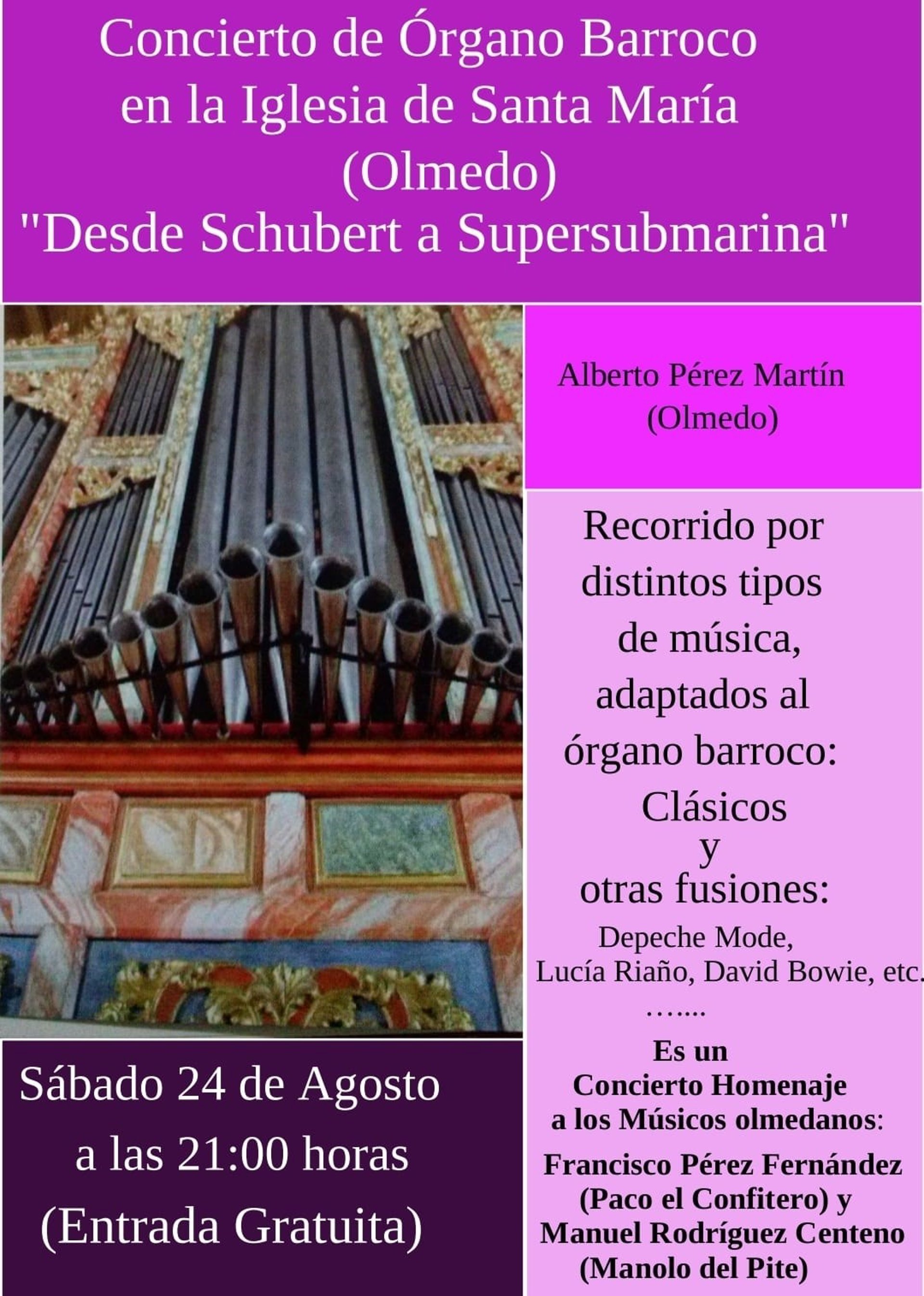 El vallisoletano Alberto Pérez Martín ofrecerá el próximo 24 de agosto un concierto en el que, a través de la variedad de sonidos del órgano barroco de la iglesia de Santa María de Olmedo, recorrerá la historia de la música, 'Desde Schubert hasta Super Submarina'.