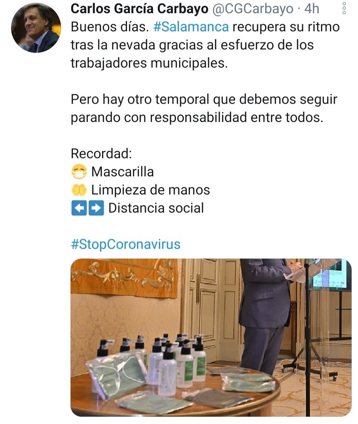 Así lo ha señalado a través de un mensaje en su perfil de Twitter, donde ha reseñado: "Buenos días. #Salamanca recupera su ritmo tras la nevada gracias al esfuerzo de los trabajadores municipales. Pero hay otro temporal que debemos seguir parando con responsabilidad entre todos. Recordad: Mascarilla, limpieza de manos, distanciamiento social.#StopCoronavirus".