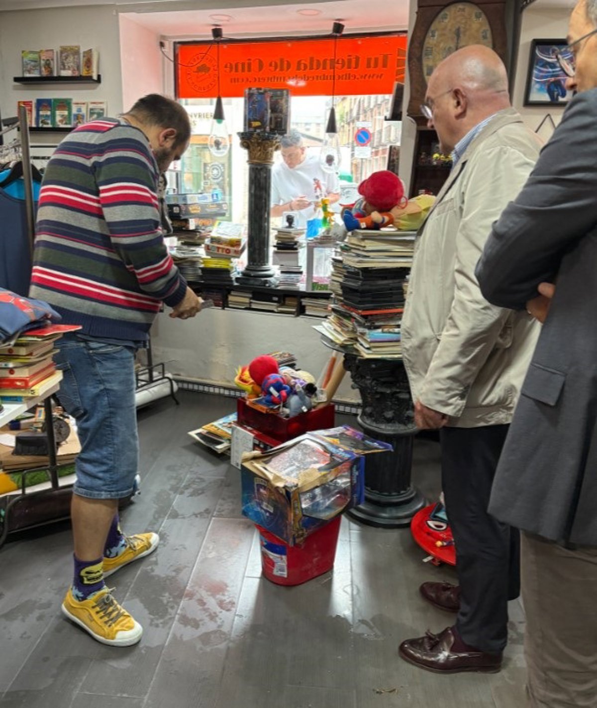El primer edil, acompañado por el concejal de Comercio, Mercados y Consumo, Víctor Martín, ha visitado los establecimientos de Platerías, una de las zonas más afectadas en el centro de la ciudad, donde ha podido conversar con sus propietarios que todavía trabajaban para acabar de achicar el agua del interior de los locales.