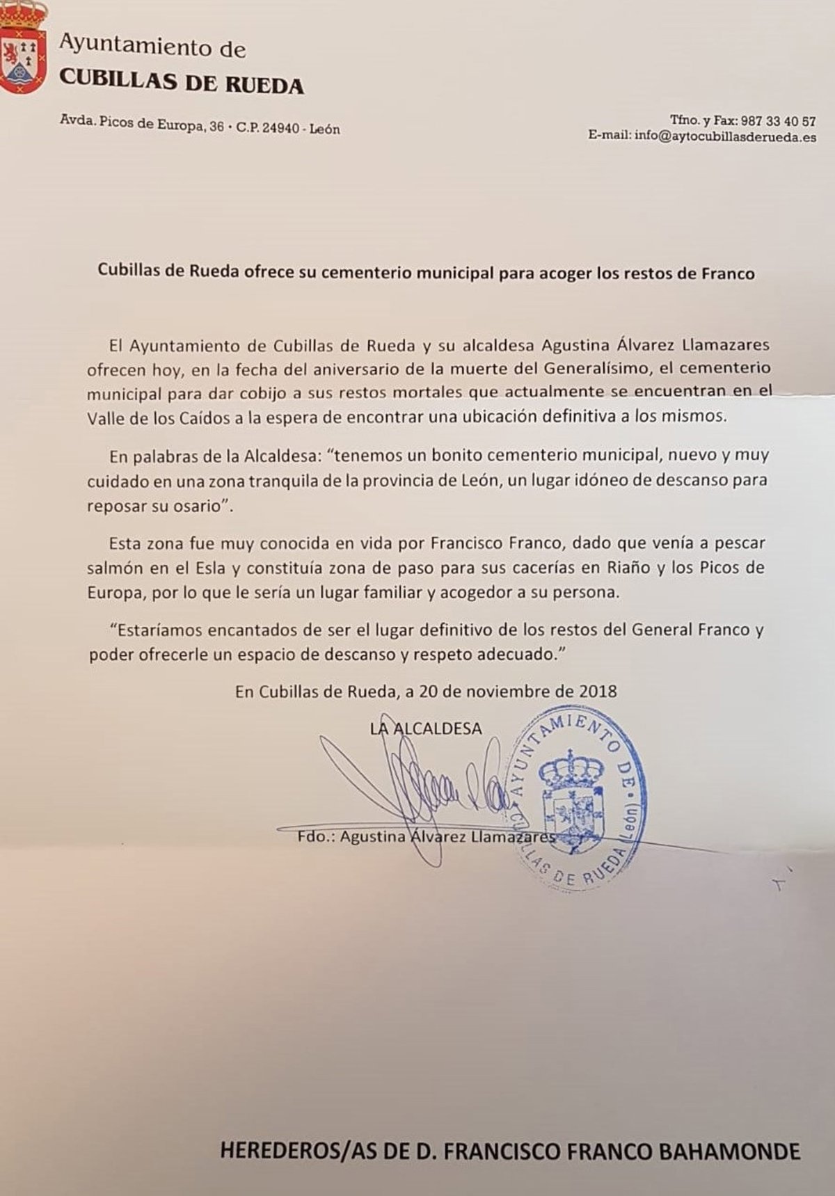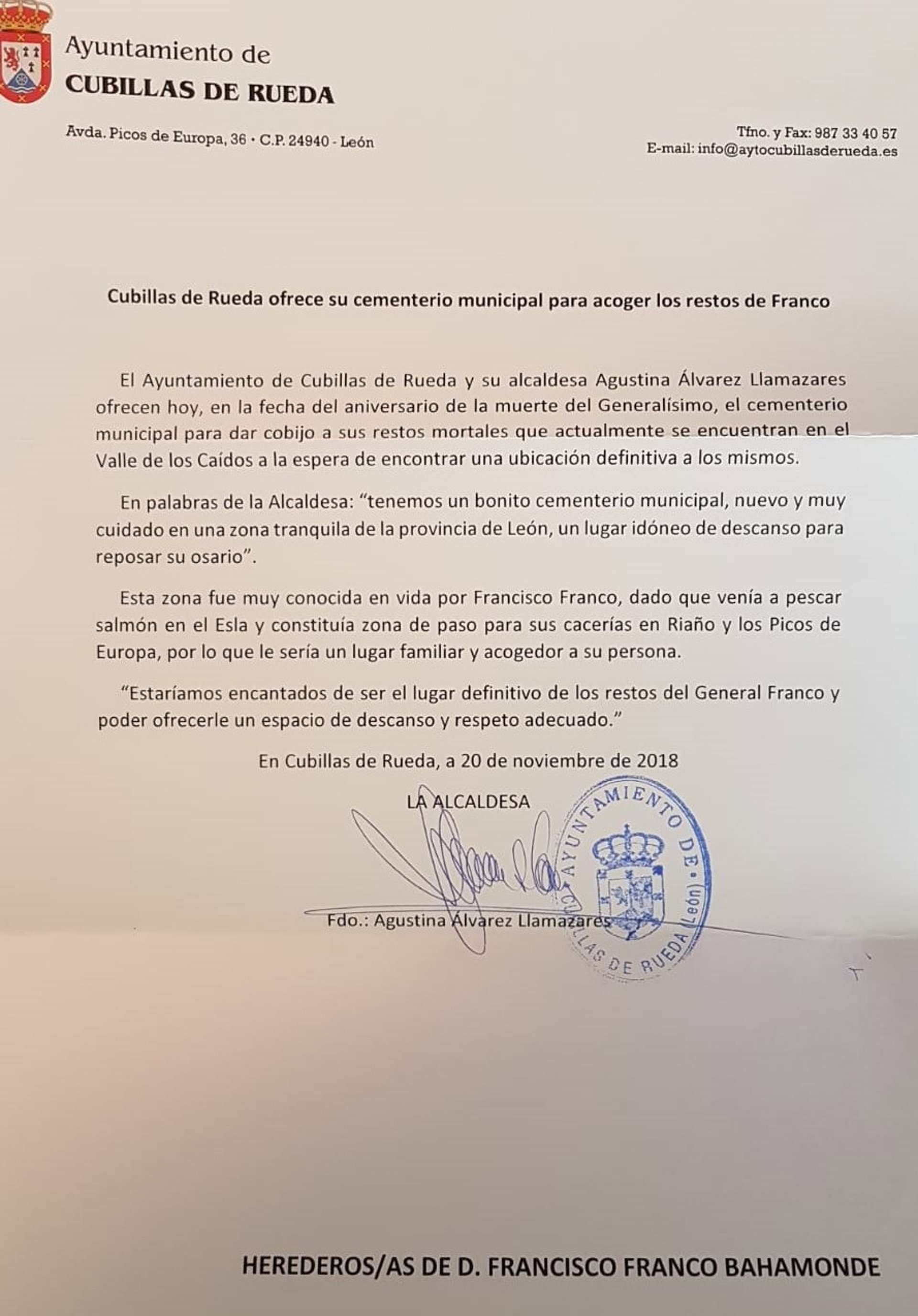La alcaldesa de Cubillas de Rueda (León), Agustina Álvarez Llamazares (PP), ofreció el pasado 20 de noviembre, a través de una carta dirigida a la Fundación Nacional Francisco Franco, el cementerio municipal de la localidad para dar cobijo a sus restos mortales que actualmente se encuentran en el Valle de los Caídos y que el Gobierno de España prevé exhumar.
