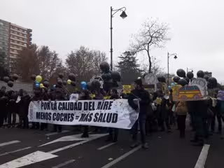 Los asistentes han partido desde la Plaza del Poniente hasta la Plaza de la Antigua encabezados por un pancarta con el lema 'Por la calidad del aire. Menos coches = más salud' y provistos de globos de color negro, azul y verde, en referencia a la transición de la contaminación provocada por la circulación de vehículos hacia un aire "más limpio y salubre".