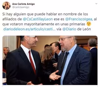 "Si hay alguien que puede hablar en nombre de los afiliados de Ciudadanos en Castilla y León, ese es Francisco Igea, al que votaron mayoritariamente en unas primarias", ha escrito Ana Carlota Amigo en su perfil, recordando el proceso en el que el actual vicepresidente se impuso a la expopular Silvia Clemente para ser candidato del partido a la Presidencia de la Junta.