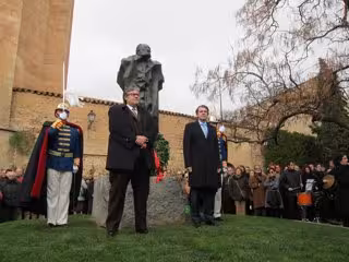 En esta ocasión, el escritor Juan Manuel de Prada y el alcalde de Salamanca, Alfonso Fernández Mañueco, han sido los encargados de realizar la tradicional ofrenda floral a Miguel de Unamuno.