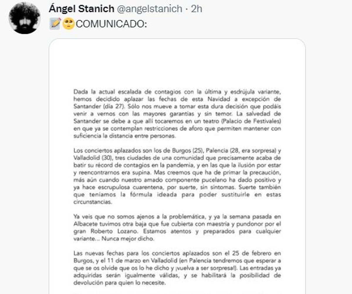 Comunicado del cantante y compositor Ángel Stanich en el que informa de la cancelación de conciertos en Burgos, Palencia y Valladolid. - ÁNGEL STANICH-TWITTER