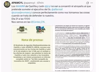 La Asociación, en un mensaje publicado en su perfil de la red 'X' (@apamcyl) recogido por Europa Press, advierte de que los agentes medioambientales de la Junta "no van a consentir el atropello" al que les pretende someter el Ejecutivo de Alfonso Fernández Mañueco.