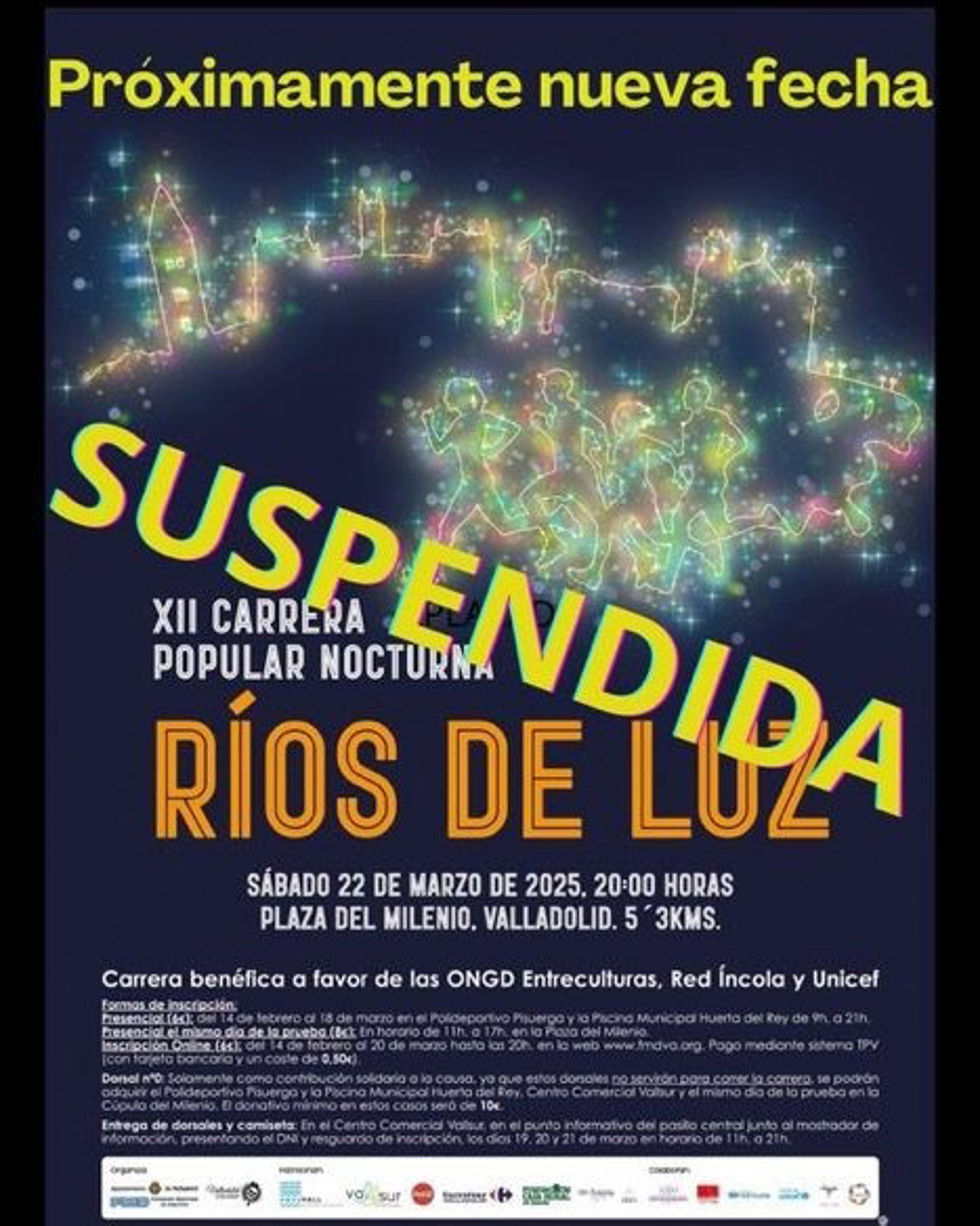 El Ayuntamiento de Valladolid ha informado de que se ha aplazado la celebración de la XII Carrera Popular Nocturna Ríos de Luz 2025, organizada por el Consistorio y su Fundación Municipal de Deportes, debido a las fuertes lluvias provocadas por el temporal.