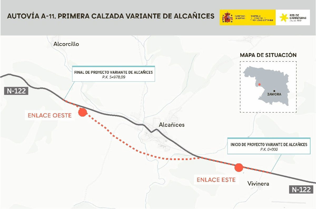 Se trata de una primera fase de la futura autovía proyectada en el tramo Fonfría - Alcañices, en la que se da prioridad a la ejecución de la variante de Alcañices por razones de seguridad viaria, que se diseña para que en un futuro pueda constituirse como la calzada derecha de la autovía A-11 en este tramo, informa el Ministerio a través de un comunicado.