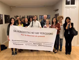 Una decena de miembros de la asociación ha formado parte de este acto de conmemoración en el interior del laboratorio artístico 11 Filas, donde, con un cartel en el que figuraba el lema 'Sin periodistas no hay periodismo. Por la libertad de prensa', entre otras consignas, la vicepresidenta, Belén Merino, ha explicado que este año se buscaba diferenciar este día con la exposición de Natalia Sancha, titulada ' Ellas. Metamorfosis Sirias'.