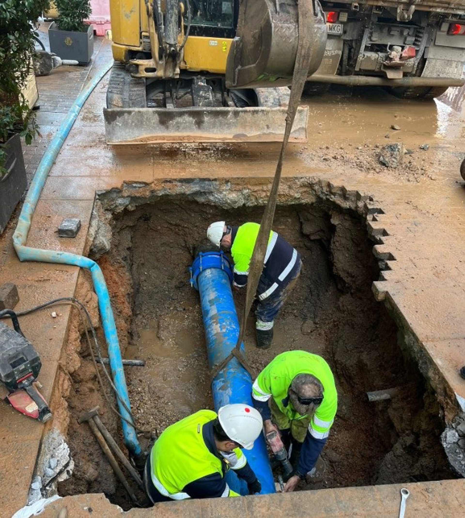 Una vez localizado el tramo de tubería roto en la calle Santiago, los equipos de Aquavall han procedido a su sustitución para restablecer el suministro lo antes posible a los afectados.