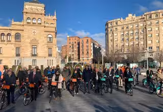 El alcalde de Valladolid, junto a miembros del equipo de Gobierno, trabajadores municipales y otros representantes, en la presentación del nuevo sistema de préstamo de bicicletas, Biki. - EUROPA PRESS