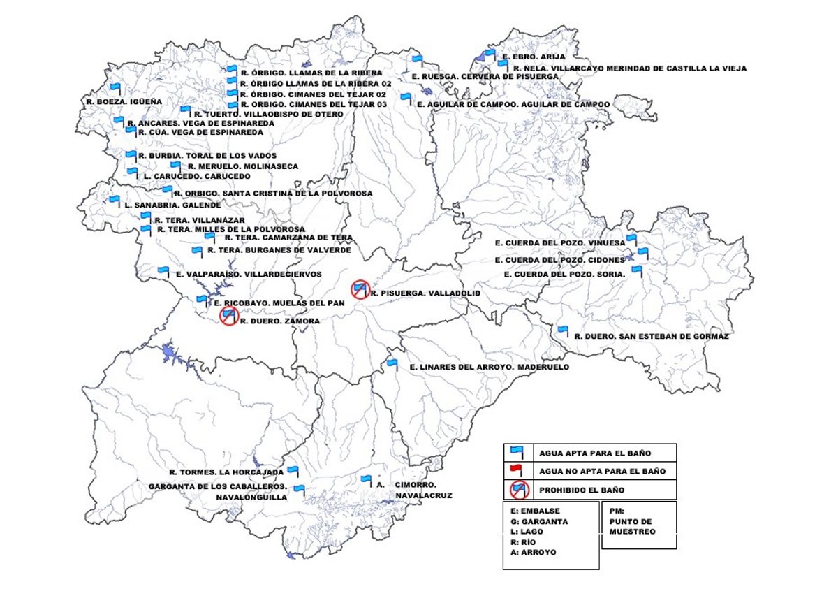 Finalmente, Segovia cuenta sólo con la del embalse de Linares del Arroyo en Maderuelo y Valladolid con la del río Pisuerga, concretamente en la plaza de las Moreras, la otra zona con la declaración de prohibición del baño.