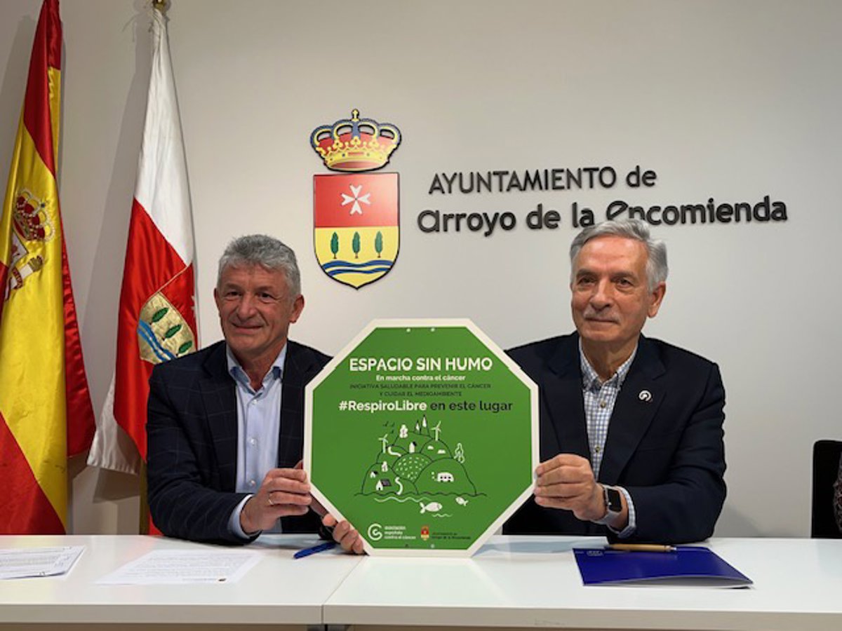 El alcalde de Ayuntamiento de Arroyo de la Encomienda, Sarbelio Fernández Pablos, y el presidente de la Junta Provincial de Valladolid de la Asociación Española contra el Cáncer en Valladolid, Artemio Domínguez González, han firmado el convenio para la inclusión del municipio en el proyecto 'Espacios sin Humo' de la AECC y que se traducirá en la conversión de 85 zonas del municipio en áreas libres humo.