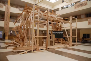 La propuesta de este artista convierte el vestíbulo de la Facultad de Filosofía y Letras en una gran estructura de vigas de madera, configurada con espacios semitransparentes conseguidos a través de la yuxtaposición de tableros, con la que pretende aludir a una especie de conglomerado de ideas sobre el desmantelamiento del Estado de Bienestar.