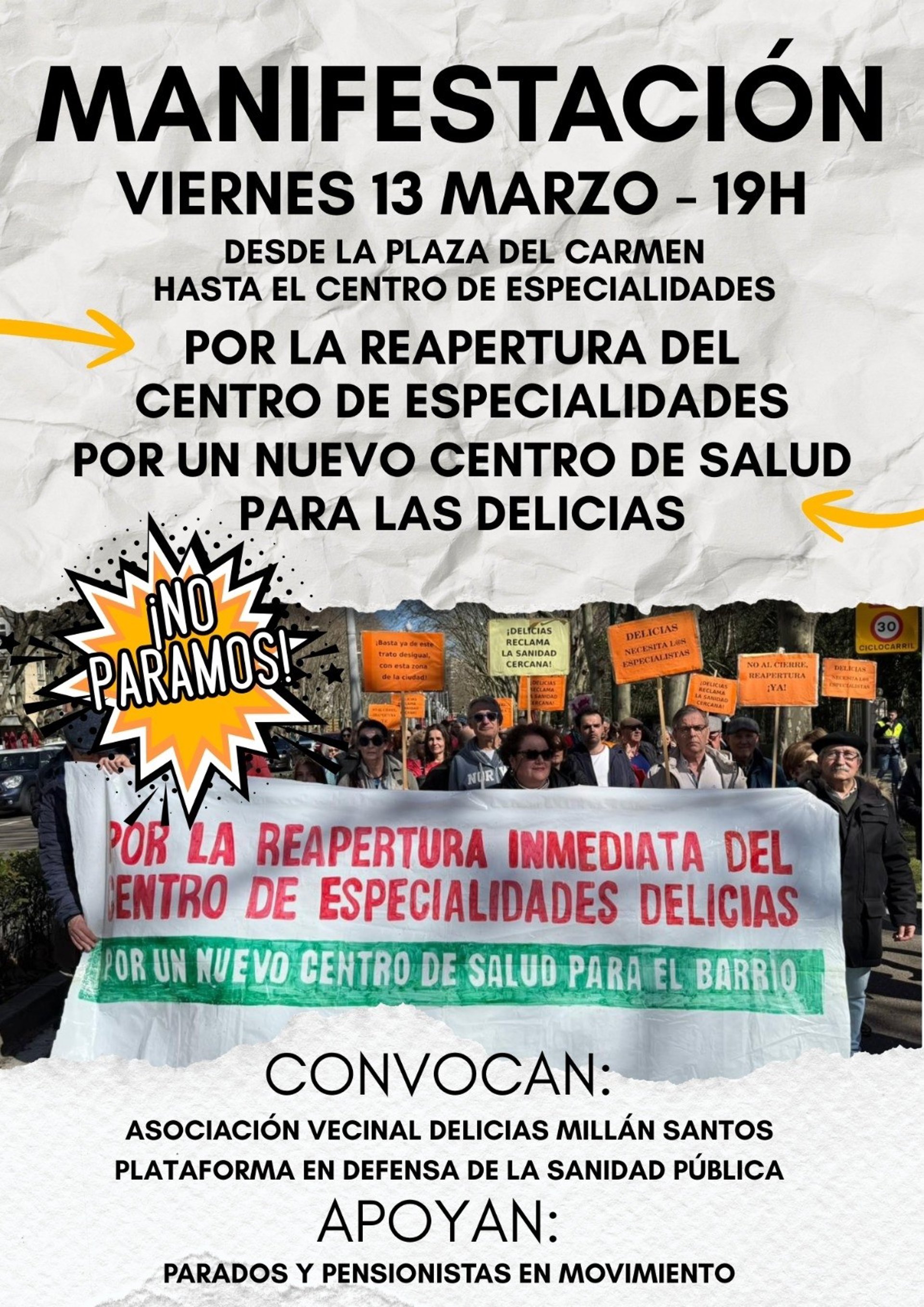 La Asociación Vecinal Delicias-Millán Santos, la Plataforma en Defensa de la Sanidad Pública y Parad@s y Pensionistas en Movimiento han convocado a una nueva movilización el próximo viernes 13 de marzo con el objetivo de reclamar la reapertura del Centro de Especialidades Delicias, en Valladolid.