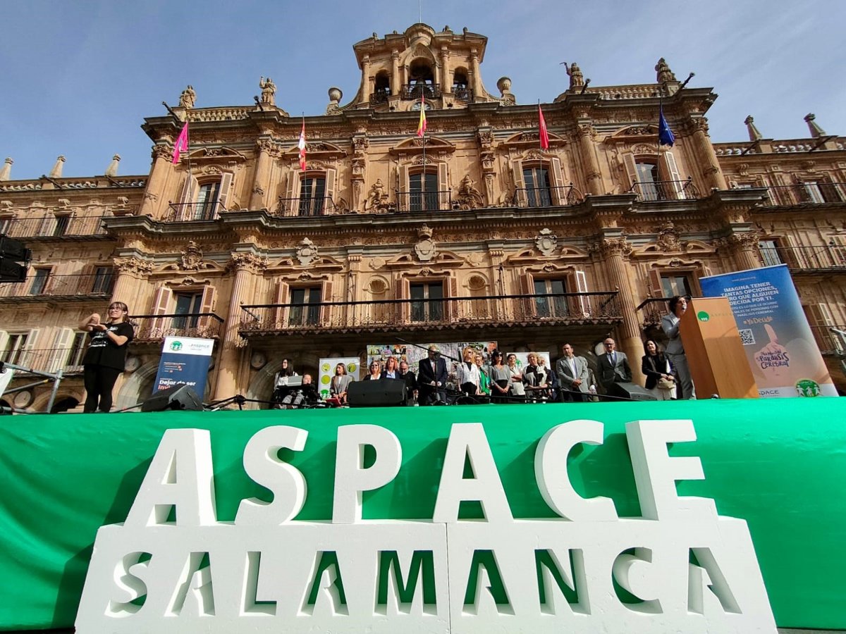 En cuanto al acto celebrado en la Plaza Mayor, ha comenzado a las 11.30 horas con la presencia de usuarios de distintos centros de Aspace Salamanca y de otros colegios y asociaciones de la ciudad.