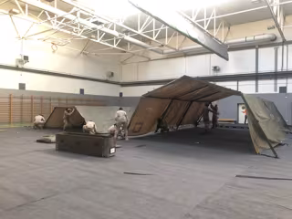 Montaje que está realizando el Ejército del Aire en el pabellón de deportes de la Facultad de Ciencias de la Actividad Física y del Deporte de la Universidad de León. - DELEG. TERRITORIAL JUNTA EN LEÓN.