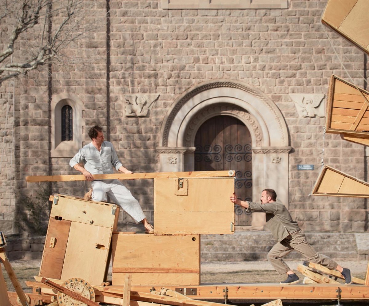 Este espectáculo muestra el proceso de construcción de un arco gigante de cajas muy pesadas utilizando como premisa la economía del esfuerzo y del movimiento, con una tecnología "ancestral, pero llena de vigencia" a través de la palanca, la polea o la rueda.