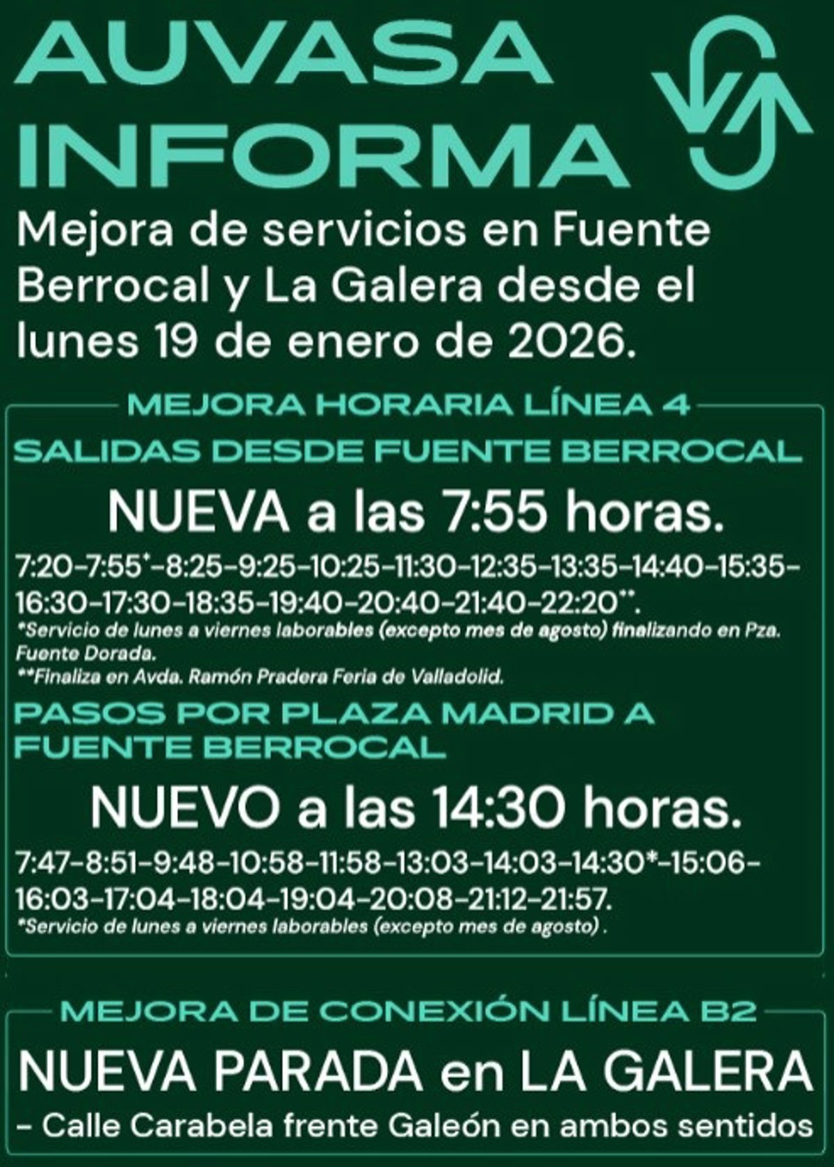 La empresa de Autobuses Urbanos de Valladolid Auvasa reforzará a partir del lunes, 19 de enero, los servicios de la línea 4 a Fuente Berrocal en horas punta y dará servicio a La Galera con el Búho 2 los fines de semana y vísperas de festivo.