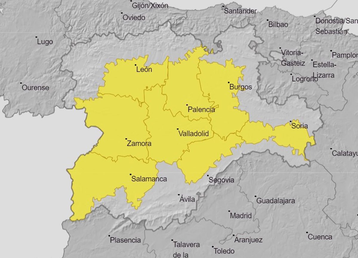 En concreto, las previsiones de la Aemet aseguran que las zonas en las que se encuentra el aviso son las mesetas de Burgos, León, Valladolid, Palencia, Zamora, Soria, Salamanca y Segovia.