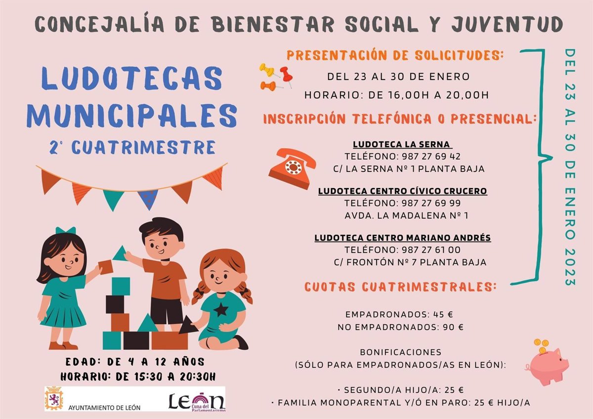 El Ayuntamiento de León, a través de la Concejalía de Bienestar Social que encabeza Vera López, abre el próximo lunes, 23 de enero, el periodo de inscripción para solicitar plaza en las ludotecas municipales destinadas a menores con edades comprendidas entre los 4 y 12 años, en horario de 15.30 a 20.30 horas.