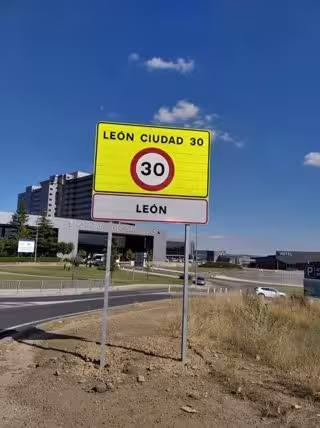 Señal instalada frente al Hospital de León para indicar que León es una ciudad con límite de velocidad de 30 km/h. - AYUNTAMIENTO